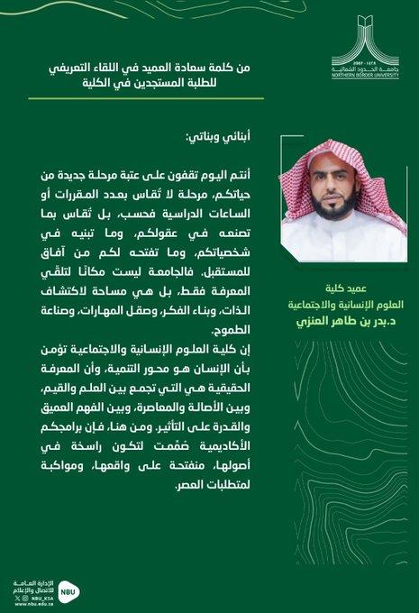 في اللقاء التعريفي للطلبة المستجدين بكلية العلوم الإنسانية والاجتماعية، أكد سعادة عميد الكلية د.بدر بن طاهر العنزي؛ أنَّ المرحلة الجامعية لا تُقاس بعدد المقررات، بل بما تصنعه من وعي، وما تبنيه من قيم، وما تفتحه من آفاق للمستقبل، مشيرًا إلى أنَّ الجامعة مساحة لبناء الذات، وصقل الفكر، وصناعة الطموح، في بيئة تعليمية راسخة في أصولها، منفتحة على آفاقها، ومواكبة لمتطلبات العصر.