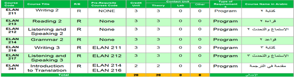 | 3 | الاستماع والتحدث 2 | يهدف المقرر الى تعزيز كفاءة الطلبة في مهارة الاستماع والفهم السماعي وكذلك مهارة التواصل الشفهي. وخلال المقرر، يتعمق الطلبة في فهم جوانب اللغة الانجليزية المحكية، مع التركيز على كل من أنماط اللغة الفصحى والعامية |
