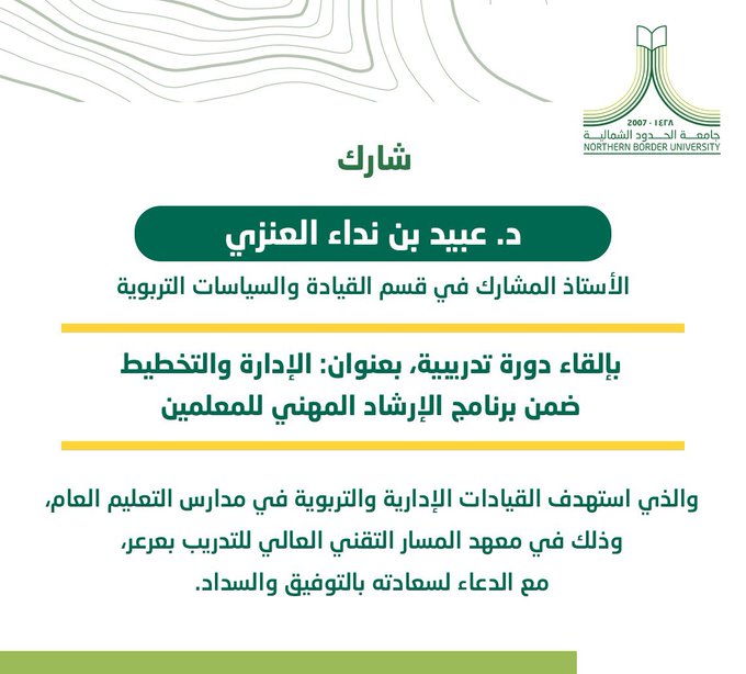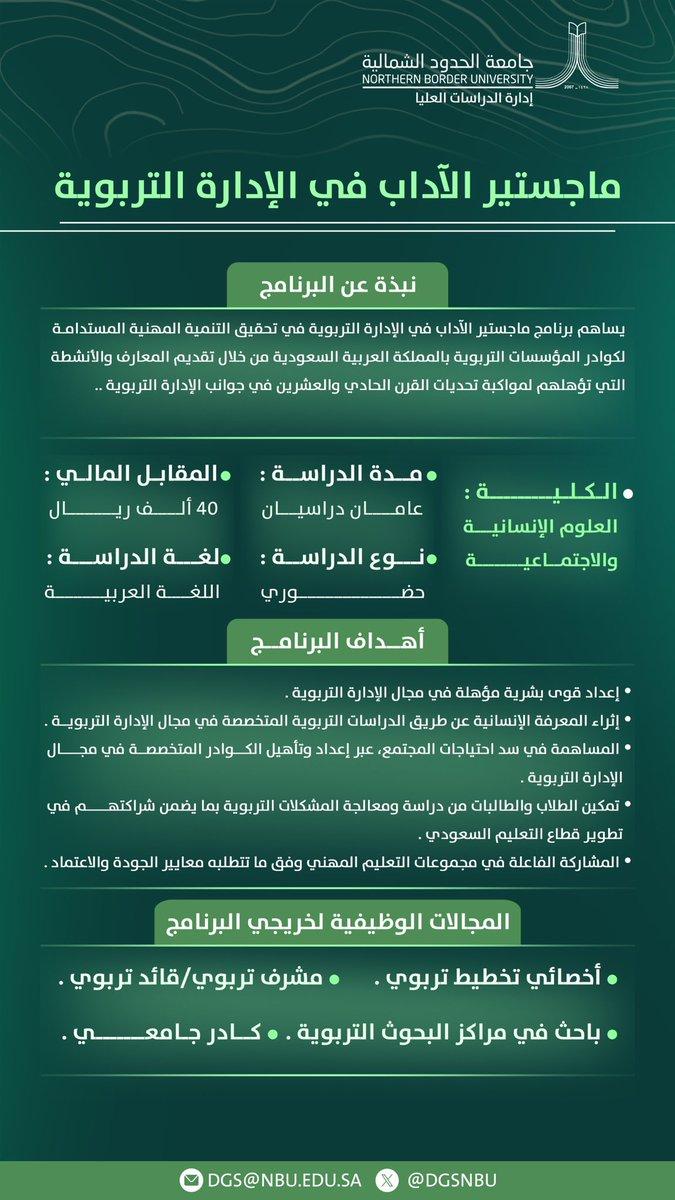 #جامعة_الحدود_الشمالية تستحدث برنامج ماجستير الآداب في الإدارة التربوية بما يواكب تطلعات تطوير التعليم وتمكين القيادات التربوية.