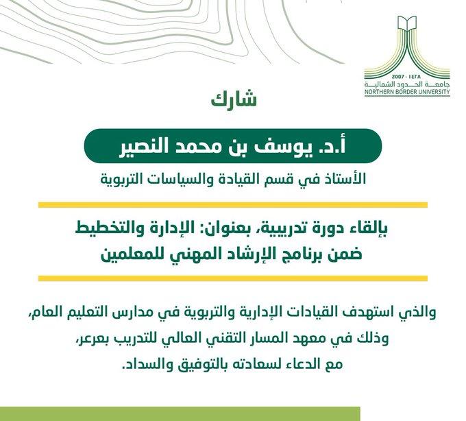 شارك سعادة أ.د.يوسف بن محمد النصير، الأستاذ في قسم القيادة والسياسات التربوية بكلية العلوم الإنسانية والاجتماعية في #جامعة_الحدود_الشمالية؛ بإلقاء دورة تدريبية، بعنوان: الإدارة والتخطيط؛ ضمن برنامج الإرشاد المهني للمعلمين، والذي استهدف القيادات الإدارية والتربوية في مدارس التعليم العام، وذلك في معهد المسار التقني العالي للتدريب بعرعر، مع الدعاء لسعادته بالتوفيق والسداد.