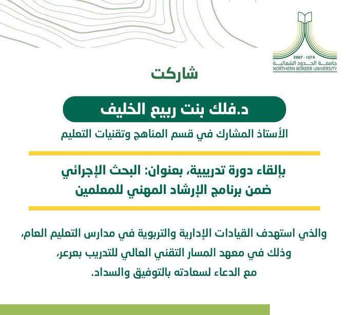 شاركت سعادة د.فلك بنت ربيع الخليف، الأستاذ المشارك في قسم المناهج وتقنيات التعليم بكلية العلوم الإنسانية والاجتماعية في #جامعة_الحدود_الشمالية؛ بإلقاء دورة تدريبية، بعنوان: البحث الإجرائي؛ ضمن برنامج الإرشاد المهني للمعلمين، والذي استهدف القيادات الإدارية والتربوية في مدارس التعليم العام، وذلك في معهد المسار التقني العالي للتدريب بعرعر، مع الدعاء لسعادتها بالتوفيق والسداد.