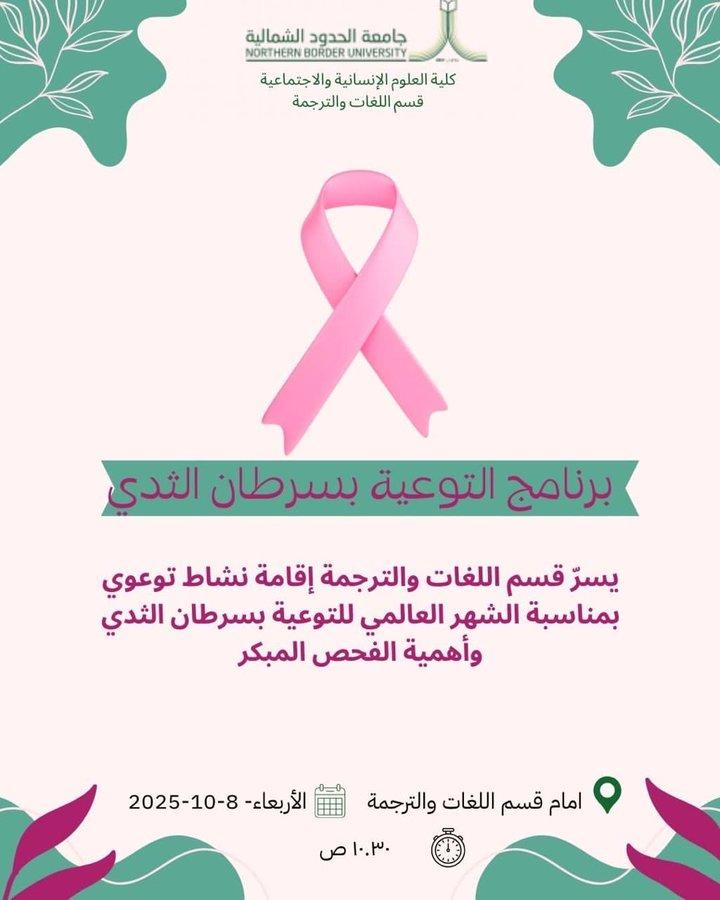 تنظم #كلية_العلوم_الإنسانية_والاجتماعية ممثلة في قسم #اللغات_والترجمة فعالية توعوية بمرض #سرطان_الثدي، وذلك بمناسبة #أكتوبر_الوردي ،الشهر العالمي للتوعية بــ #سرطان_الثدي وأهمية الفحص المبكر، تحتوي الفعالية على عروض ومنشورات توعوية ومسابقات للطالبات.